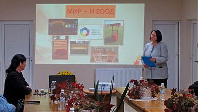 Управителят на МИР-И ЕООД,  Мими Иванова, представи дейността и постиженията на дружеството, продуктовото портфолио и социалната му мисия. Присъстващите се запознаха с широката гама от дейности, които осигуряват постоянна заетост на хората в предприятието. МИР-И ЕООД развива дейности в областта на: